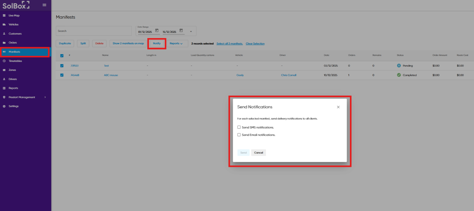 This article explains how to send customer notifications in bulk from the Manifests screen in SolBox.