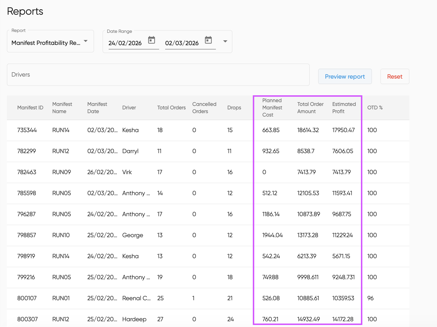 When delivery pricing and cost rates are configured correctly, the manifest view provides clear visibility into both revenue and operational cost.