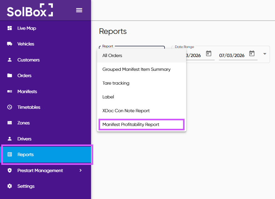 Go to Reports, select the date range, then choose Manifest Profitability Report from the dropdown.