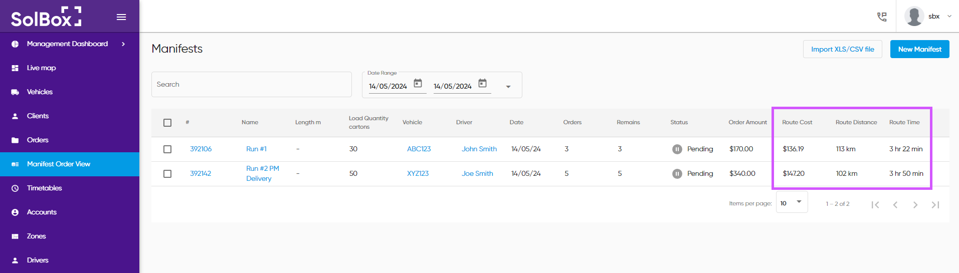 The 'Route Cost' is displayed along with the 'Route Distance' and 'Route Time' on the Manifest Order View.