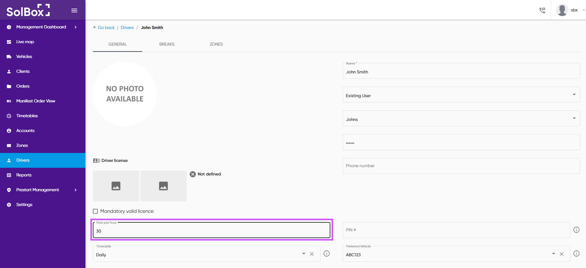 Go to "Drivers" section, select a driver and specify the driver's hourly wage on the "Rate per hour" field.
