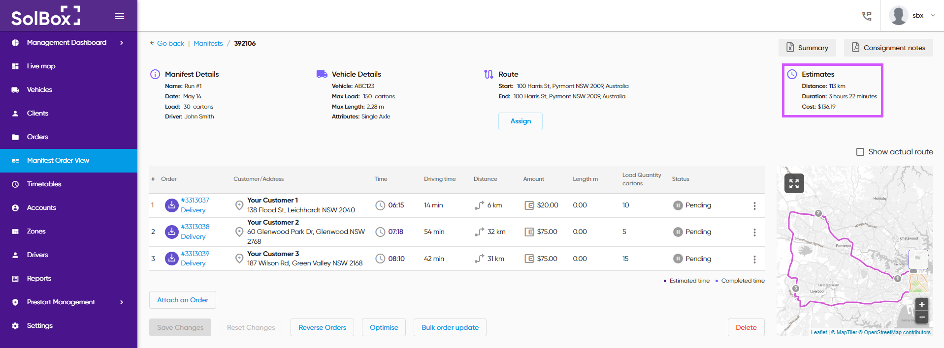 Once a cost per kilometre and driver's hourly rate have been established, the system will calculate the total cost by multiplying the driver's hourly rate by the time it will take to complete the entire run, and then incorporate the cost per kilometre based on the estimated distance.
