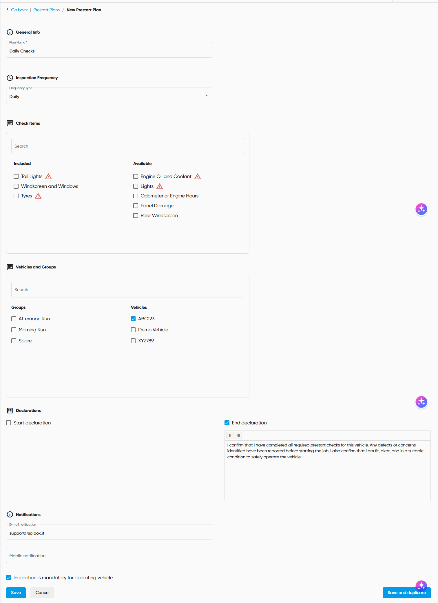 Prestart items are created and managed under Prestart Settings, where you can add additional instructions or descriptions for each item. This guides drivers on what to check.